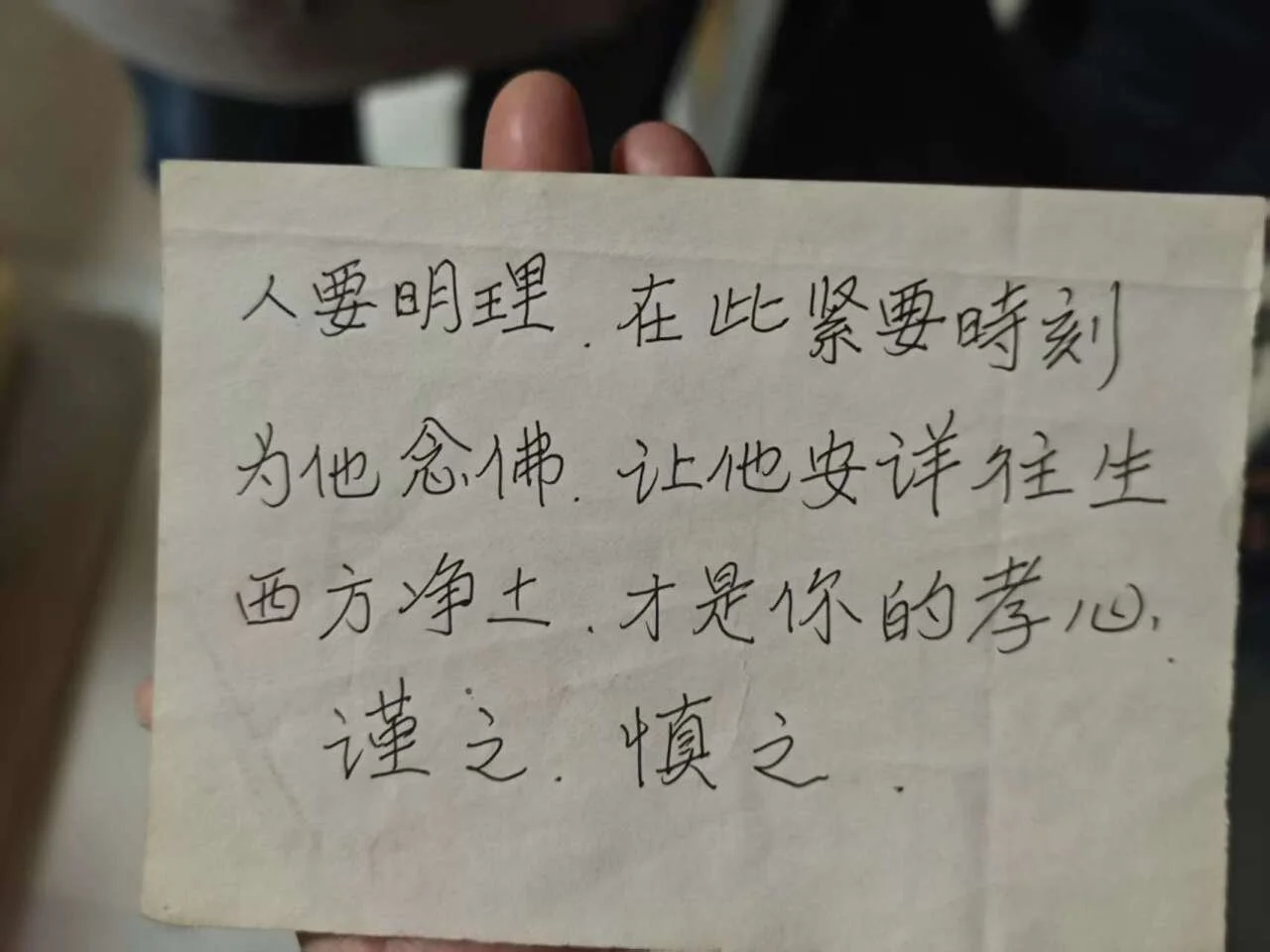 3.在往生被里,准备了早写好的便笺纸条,给子女留言:人要明理,在此紧要时刻,为他念佛,让他安详往生西方净土,才是你的孝心。谨之,慎之。