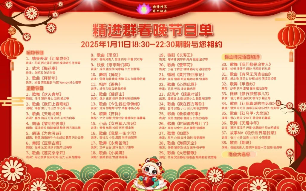 2025年精进群春节联欢晚会于2025年1月11日晚上举行,晚会一共有3个暖场节目和38个正播节目,从晚上6点半开始一直到10点半结束,主要展现了师兄们学佛修行的点点滴滴,很多师兄表示,今年的春晚节目质量比去年又有了提高。